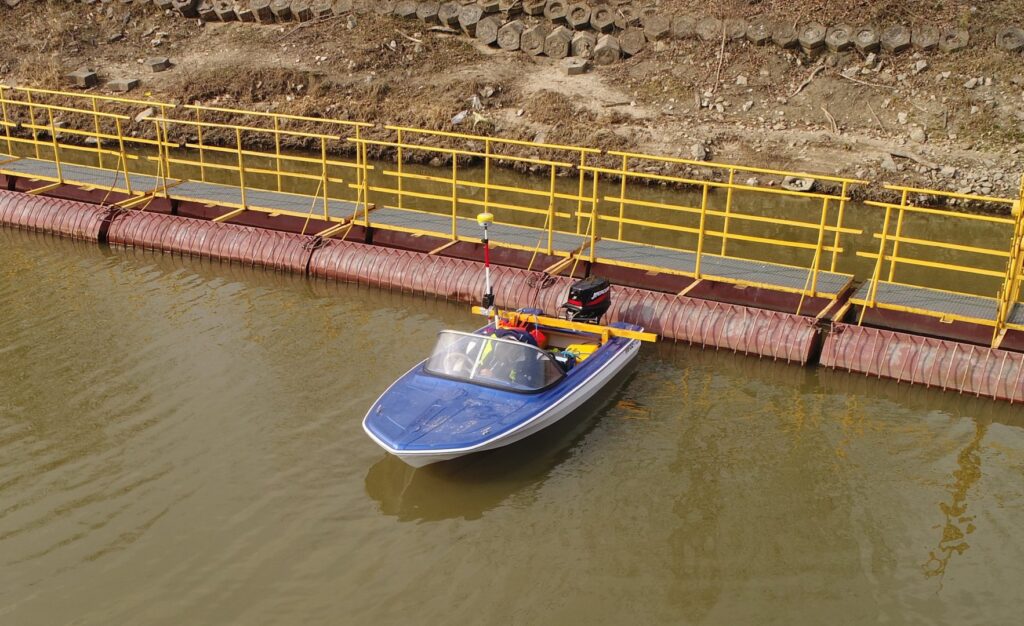 Do pracy w batymetrii niezbędna jest jeszcze jednostka pływająca. W PKIG wykorzystujemy różne – w zależności od charakterystyki obiektu. Używamy zarówno profesjonalnych łodzi motorowych jak i klasycznych pontonów do trudno dostępnych obszarów.